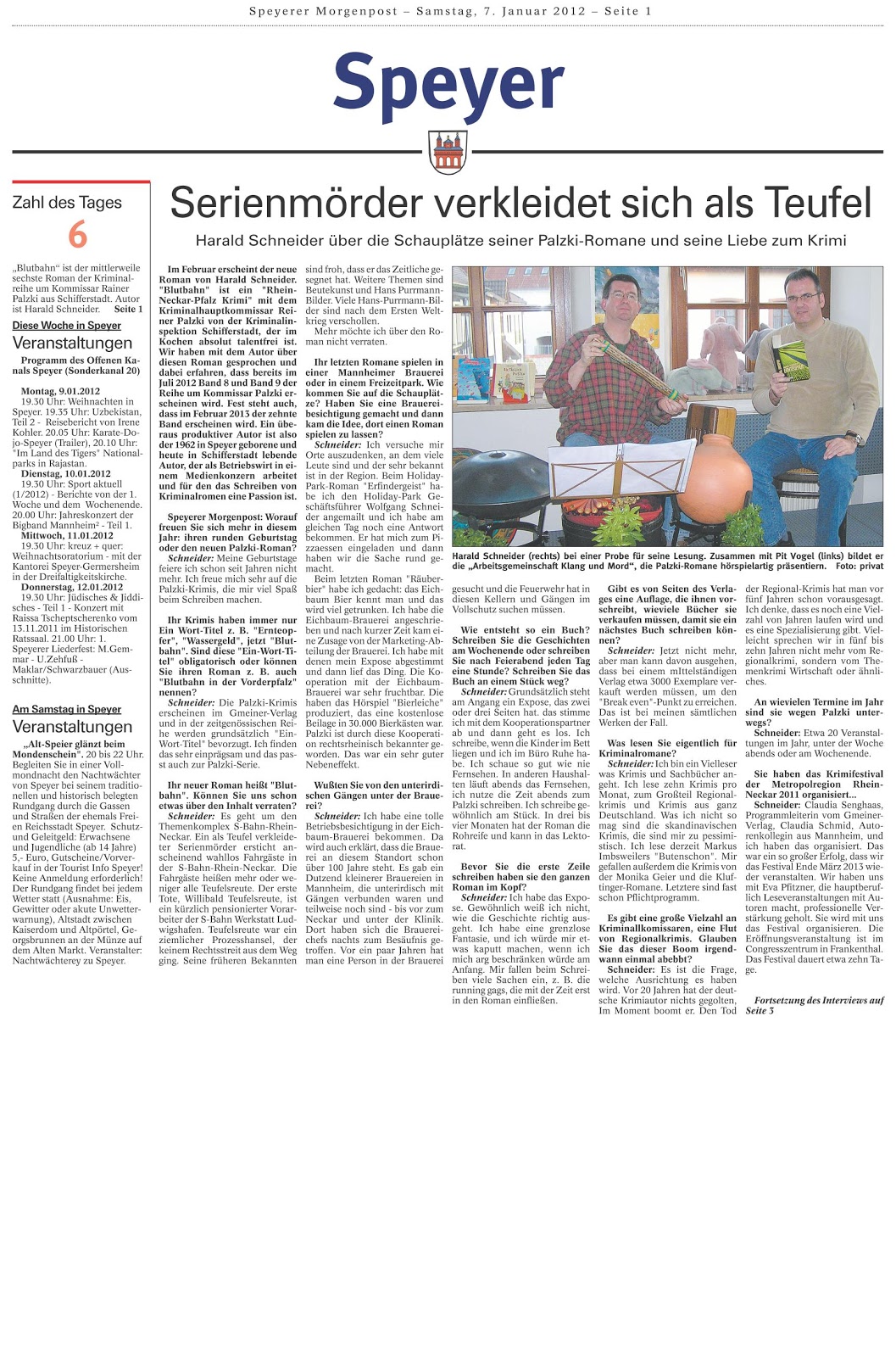 Am 25. November 2011 haben die Stadtbibliothek Germersheim, die Freunde der Stadtbibliothek Germersheim und die Lokale Agenda 21 im schönen Ambiente des Hufeisens ein Schmankerl serviert. Der Schriftsteller Harald Schneider aus Schifferstadt stellte seinen 5. Kriminalroman Räuberbier - Kommissar Palzkis aktueller Fall vor, an seiner Seite der Percussionist Pit Vogel. Es war eine Freude beiden zuzuhören und zuzusehen. Der Spaß, den beide Künstler an ihrem Vortrag hatten, ging auf die Zuschauer über. Es wurde viel geschmunzelt und gelacht. Langer Applaus belohnte die Künstler.Das Duo bietet unter dem Namen Arbeitsgemeinschaft Klang und Mord Krimilesungen mit musikalischer Begleitung an und setzt mit ironischer Situationskomik die Handlung der Palzki-Romane um.